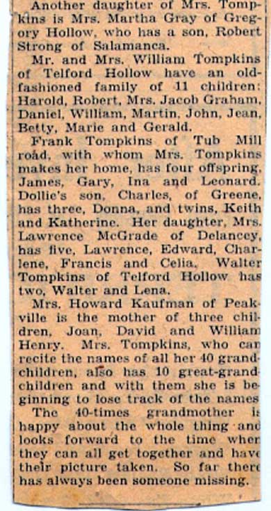 Photo on right: Penny Lynn Hulbert is the fifth generation on her mother's side of the family also. Her great gret grandmother, Mrs. Dolly Tompkins of Downsville, is holding Penny. Standing, left to right, are her mother, Mrs. Janice Hulbert, her grandfather, Francis Terry of Unadilla, and her great grandmother, Mrs. Anne Hall of Argyle.
