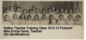I’ve found among my grandmother's many photo’s a postcard of a Walton Teacher Training Class with the notation that it was the Class of "1912-13 Miss Emma Davis, Teacher". I’m wondering if my postcard is a photo of a first year class? My grandmother is not in photo at left. --Paula Hughson, Jan 12, 2016 ... (click photo to view larger)
