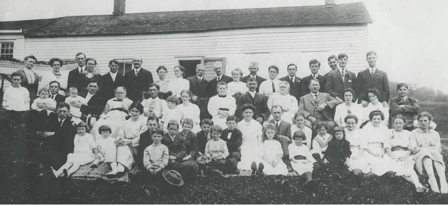 Back row: Martha Bryden Aikens, Ella Betsinger Bryden (w/o Robert), Elmer Aikens, Susie Scoville Redmond (w/o/ George), George Redmond, ? male Elliott, ?female Elliott, Maggie Gemmel, Charles Gemmel, Wally Smith, Hattie Smith Redmond, James Nevin Laing, Helen Redmond Laing, Robert Gemmel, Arnold Ruff, Arthur Laing, Harold Smith, James A. Laing.