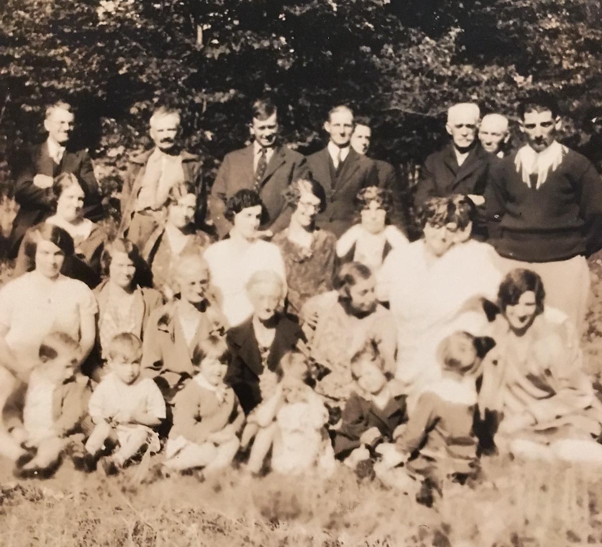 I'm not sure who these people are. The 4th from the left in the 2nd row of adults is Sadie Kelly (Raeder). The 4th from the left in the first row of adults is Anna Kelly, Sadie's mother.
