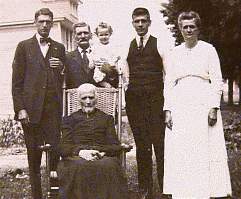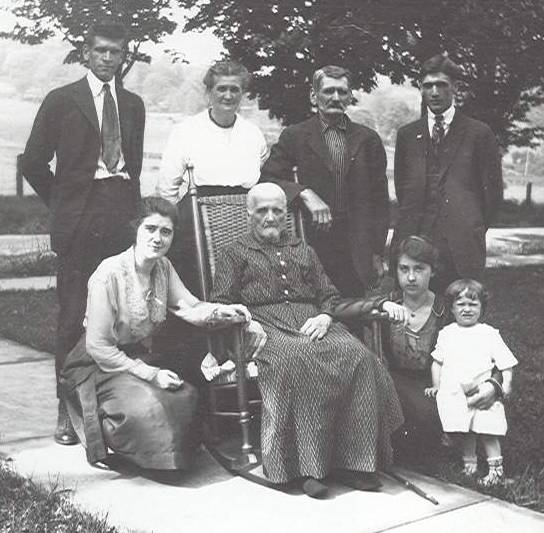 4 Generations: L-R Guy Chichester, his father Delbert Chichester holding Laura Chichester, Seth Chichester, Libby Engle Chichester. In the chair is Catharine Traver Chichester. Date summer 1919.