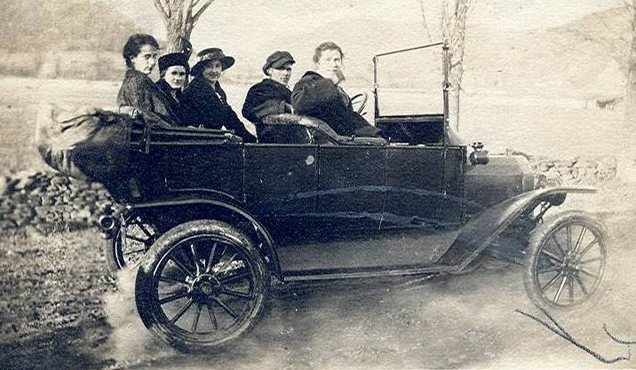 In the car, far left is Inda Young Chichester. In the front: Dick Carson (driver) and his wife, Edna Young Carson.