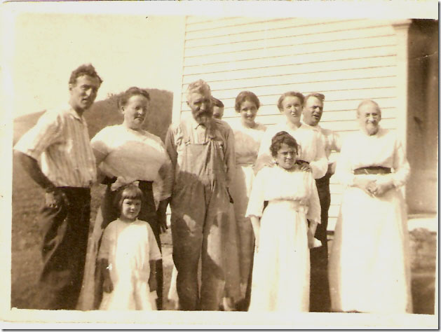 Back row (left to right): Leon Gray, his mom - Abbie (Terry) Gray; his dad, Myron Agustus Gray; (probably the hidden one is Leon’s wife, Agnes); his sister, Elsie Gray; Ella (Thompson) Terry, (wife to Douglas); Douglas Terry; Grandma, Esther (Fuller) Terry.