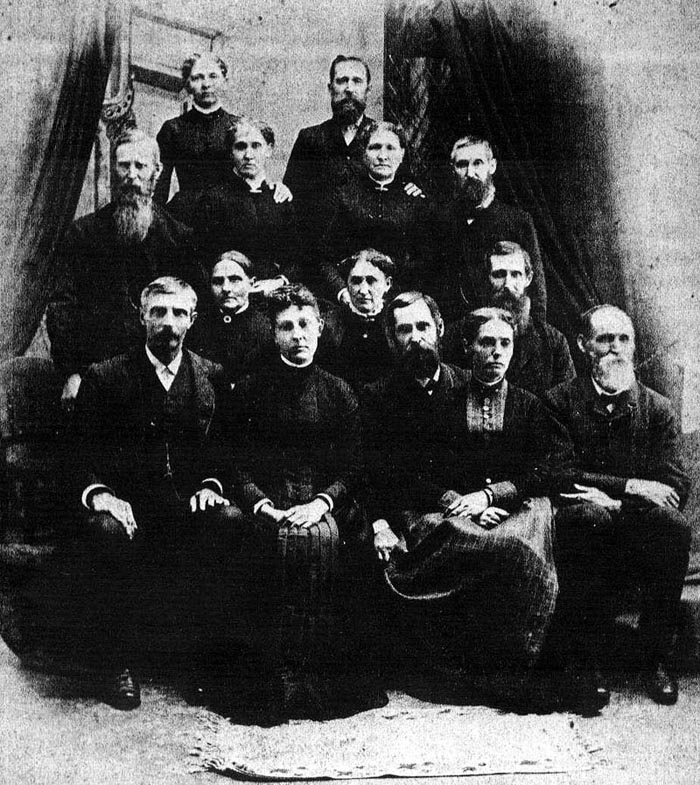 Front: Herman Goodrich, Sarah Jane Benedict, Marcus Benedict, Roselia (Benton), Ebenzer Smith; 2nd: Jane (Shannon), Katy (Katherine Clark), Stephen Benedict; 3rd: Curtis Benedict, Elizabeth Benedict, Lavinda (Seely), Daniel Benedict; Back: Hannah (Wells), Matthew Benedict