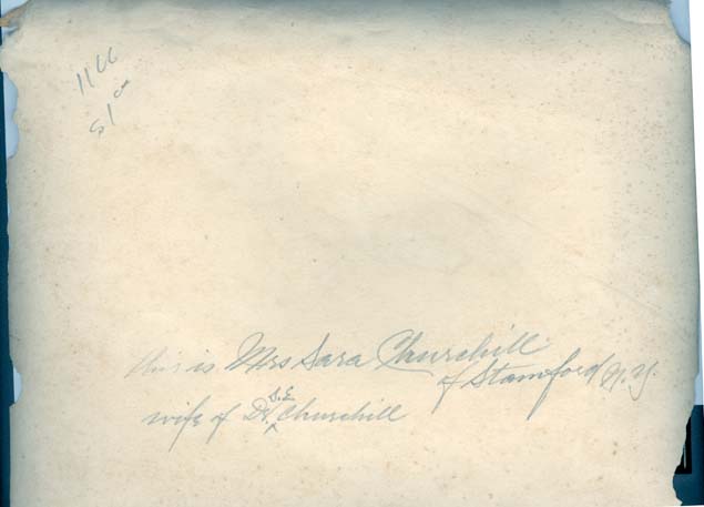 Written on back side of photo "This is Mrs. Sara Churchill of Stamford, N.Y. wife, of Dr. S. E. Churchill"
