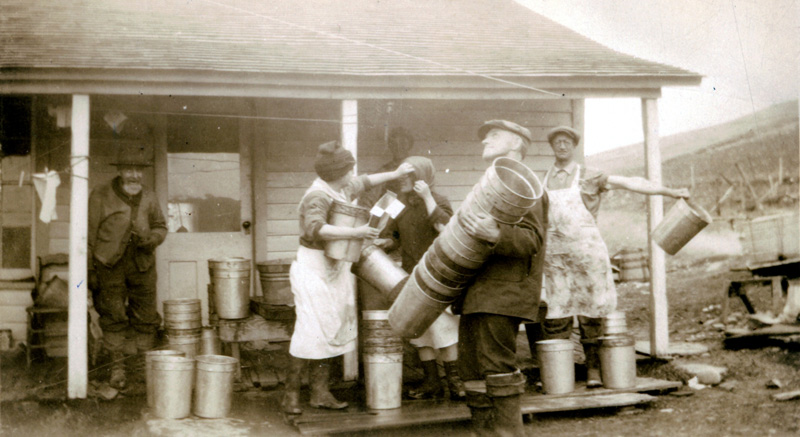 Bottom Photo: Washing The Sap Buckets - the sap buckets must be cleaned before and after using to collect the sap from the maple trees. WORKING together are Joe Hess, Pearl (Hess) Couse, Hobert Couse (in front), Marian (Hess) Burnside, Edgar Couse (in back), and Will Pope (washing the sap buckets).