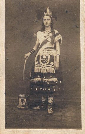 This is a picture from my grandmother's ancestral album. My grandmother was Istania (Dillon)McConnell of Hancock. I have compared it to others in the album, and the face looks like a young picture of my great grandmother Anna Funday (Wakeman) Dillon (Istania's mother). She is in a Native American costume. I have shown it to members of the Navajo, Hopi and Apache tribes out here and they have told me that it appears authentic. There has always been some family hearsay that Native American blood existed in my ancestral line, and it would be great if it could be proven as from the Lennai-Lenape (?) or Delaware tribe. --Tom McConnell, Scottsdale, AZ