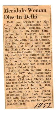 Laura May Sterry Rockefeller is my gt Aunt. Jefferson Rockefeller was my Grandmother Alice Rockefeller Cooke Tait's brother. I had no idea she was alive until 1952. This obit will help fill a hole in my records. If there are any other surviving members of their family, would love to hear from them. Harriett Schultz - posted here November 19, 2009