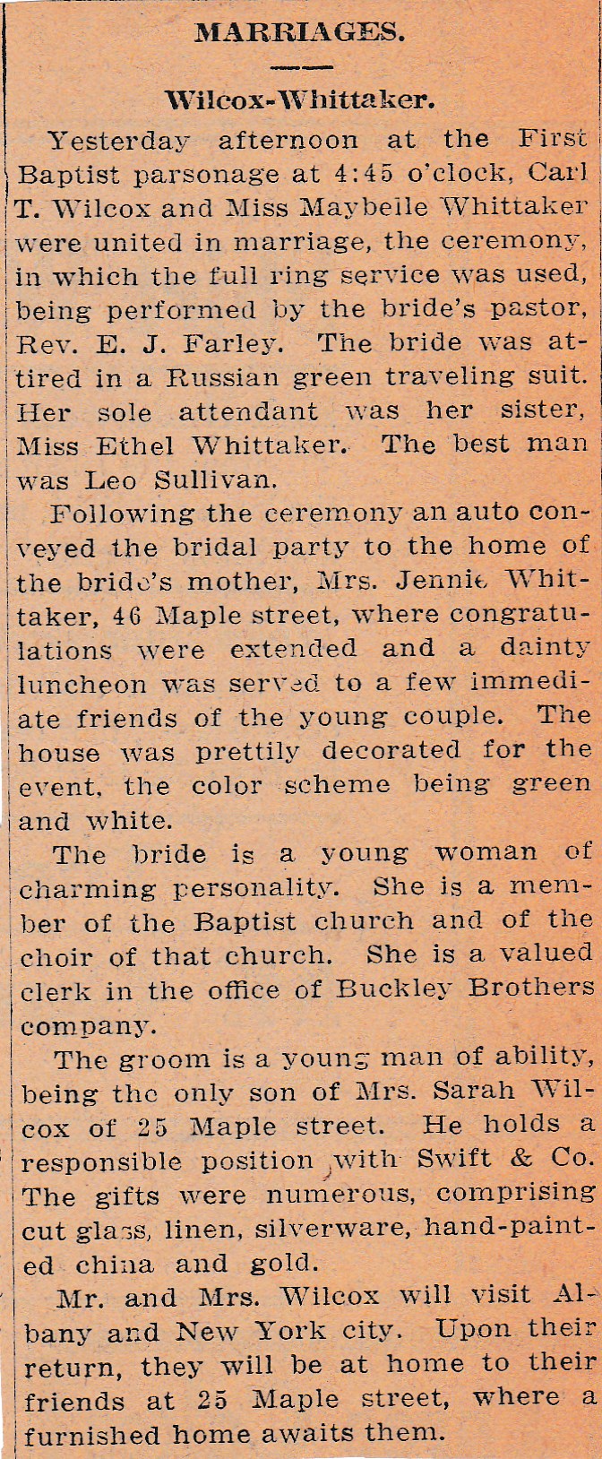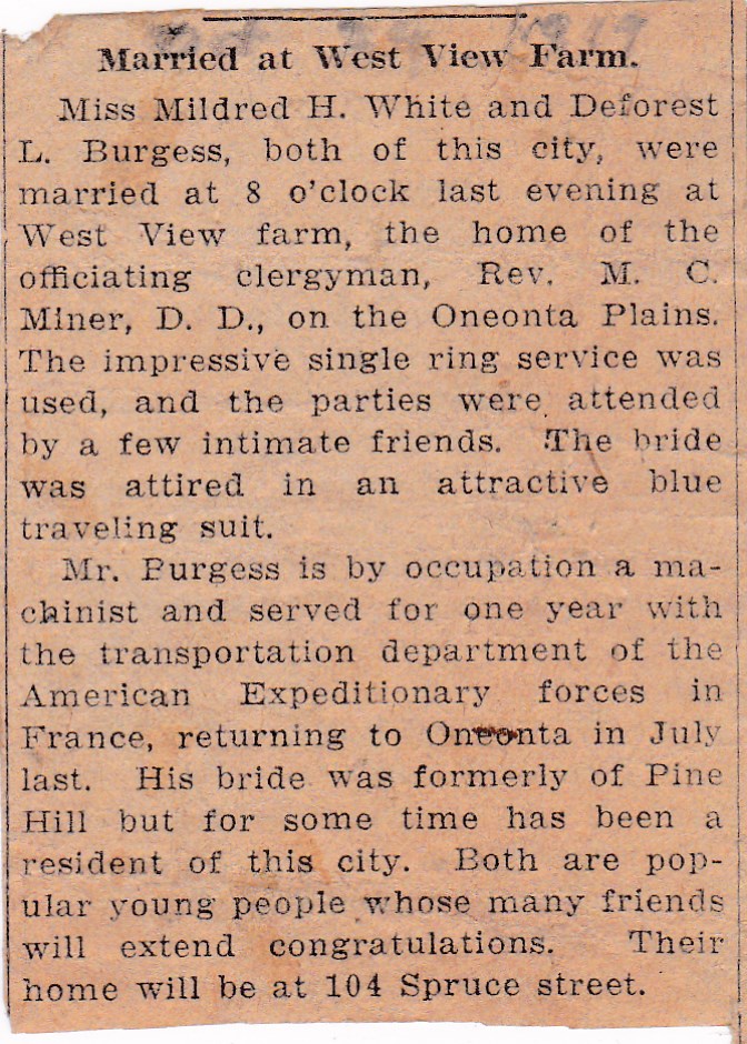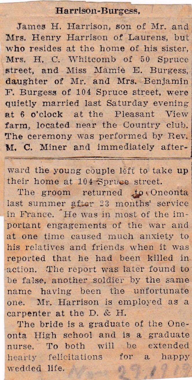 James H. Harrison - Mamie Burgess Marriage - also see Harrison's Safety Confirmed (The Oneonta Star after 3-1919)