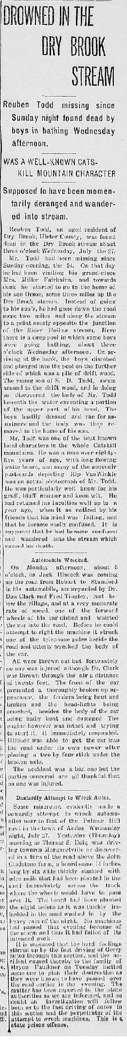 This is the obituary for my great great grandfather, Reuben Todd, of Seager, The Town of Hardenburgh, Ulster County, and a grandson of Samuel Todd the Revolutionary War soldier and the son of Samuel Todd Jr, an 1812 veteran and his wife, Eliza Abell of Redkill in the Town of Middletown, Delaware County. --Edward Stewart