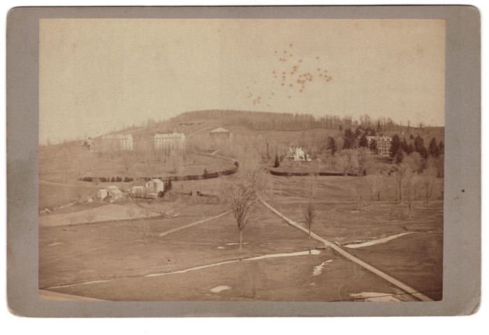 This is believed to be somewhere in Delaware County as the photographer was from Franklin NY. I'd say it dates from the 1880's. There is a distinctive building at right, but I've been unable to identify it or any of the other buildings in the picture, hoping they would point to the town. It certainly does not look like other photo's from Franklin, but I realize it may all be about angles.