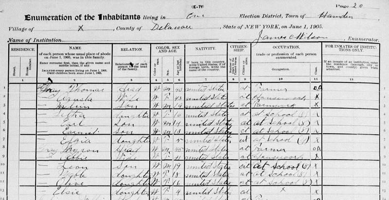 New York State Census, 1905, database with images, FamilySearch (https://familysearch.org/ark:/61903/1:1:MKM3-MDF : 26 November 2014), Leon Gray, Hamden, E.D. 01, Delaware, New York; citing p. 20, line 10, county offices, New York.; FHL microfilm 832,854.