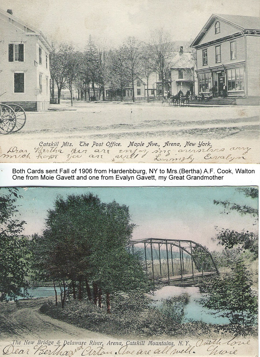 Both cards sent Fall of 1906 from Hardenburg, NY to Mrs. (Bertha)A.F. Cook, Walton