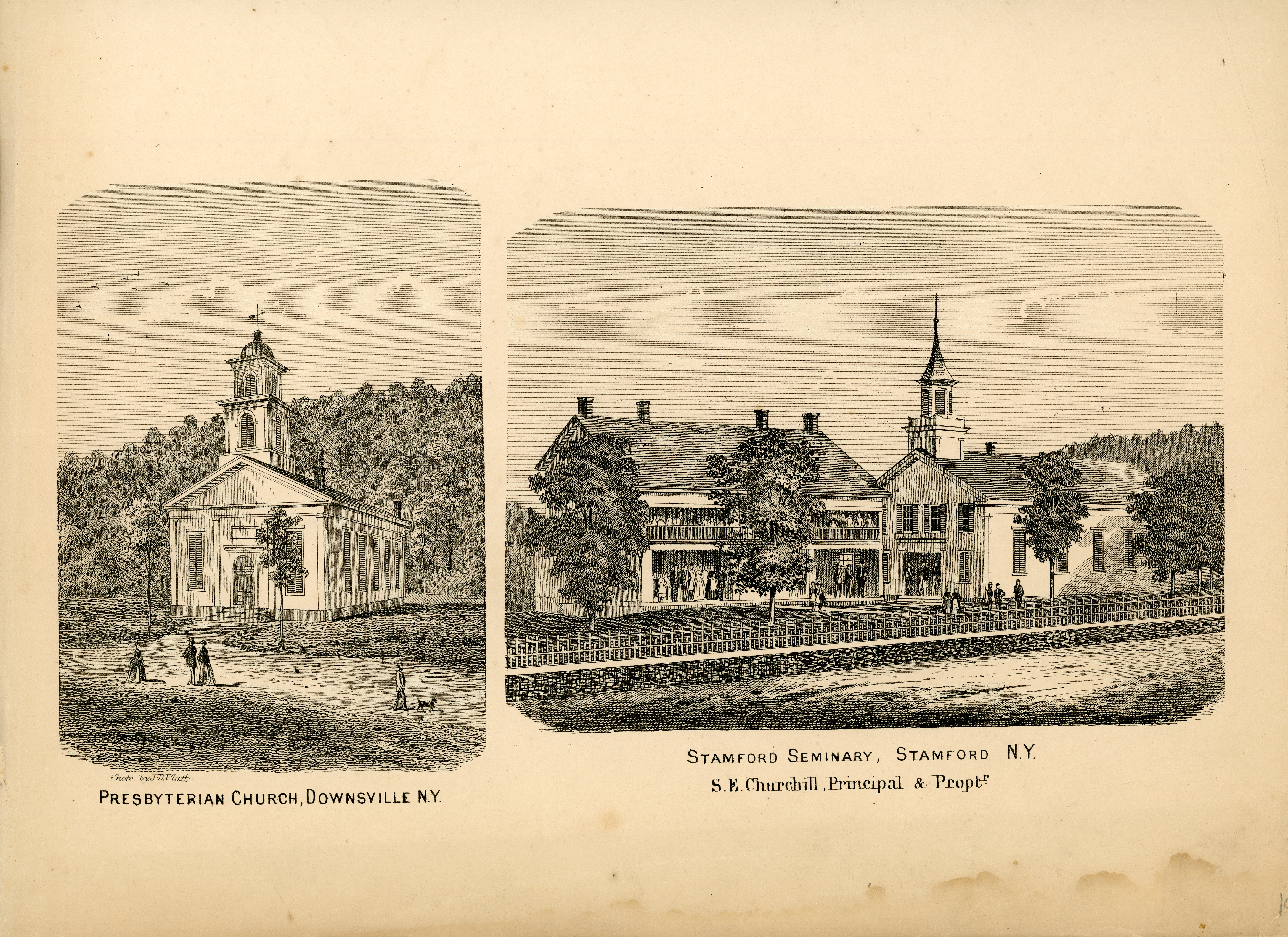 VIEWS - Presbyterian Church, Downsville, N.Y. & Stamford Seminary, Stamford, N.Y.; S.E. Churchill, Principal & Propt.