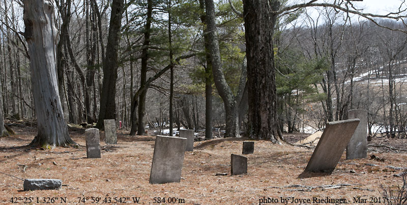 This cemetery is located way up on Coe Hill Road (past the intersection of Coe Hill Road and Prosser Hollow Road. When Tar and I drove up, we visited with the very friendly owner of the property that surrounds the little burying ground which is right by the side of the road. He stated that the Town of Davenport does basic maintenance work on the cemetery each year. --Joyce Riedinger, April 1, 2017 - click photos below to view larger size