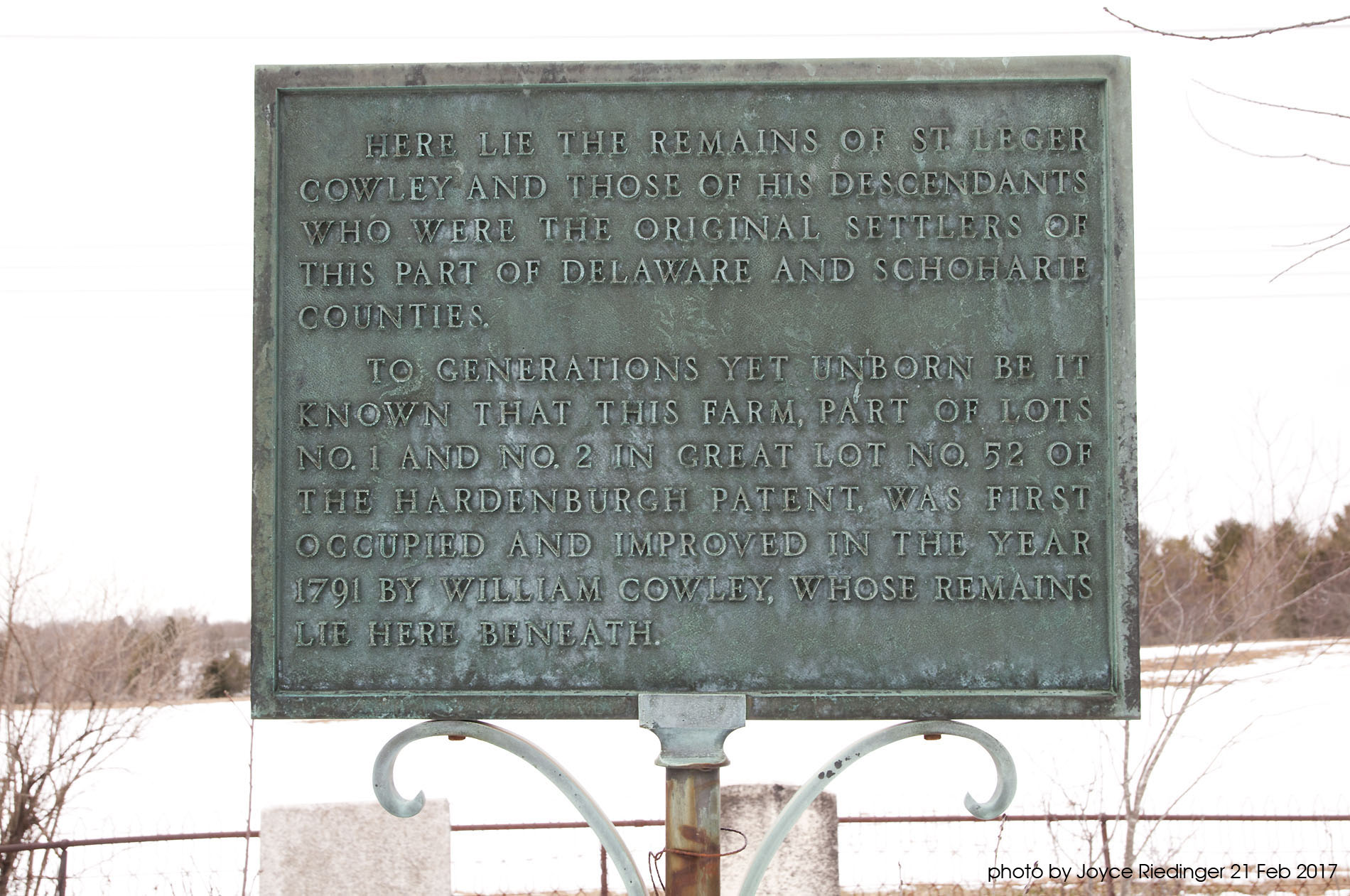 To generations yet unborn be it known that this farm, part of Lots No. 1 and No. 2 in Great Lot No. 52 of the Hardenburgh Patent, was first occupied and improved in the year 1791 by William Cowley, whose remains lie here beneath.