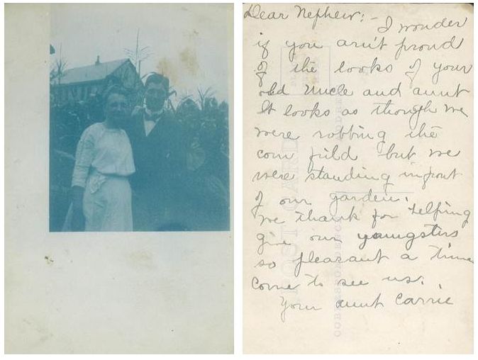 This photo came from a box of old post cards that I inherited. They were sent to Wesley C & Ruth (Schriver) Brundege and Wes's mother Alice I Scofield Brundege. Some of the postcards are signed VAR which I believe stands for Violetta Adelia (Reynolds) Mathews, mother-in-law of Wesley’s brother, Clinton and his wife Laura Mathews. -- Dawn Fleming March 30, 2015