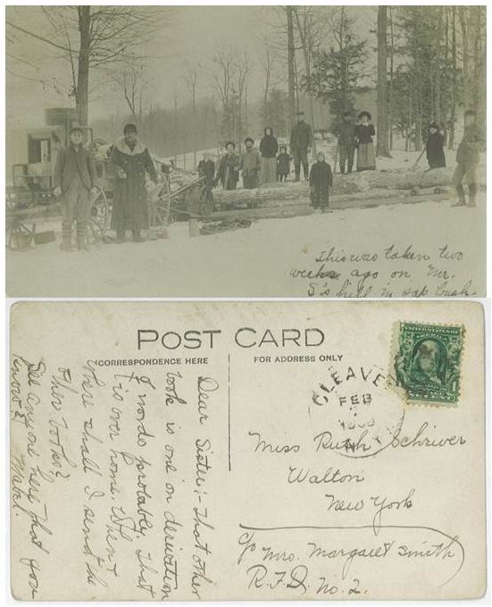 This photo came from a box of old post cards that I inherited. They were sent to Wesley C & Ruth (Schriver) Brundege and Wes's mother Alice I Scofield Brundege. Some of the postcards are signed VAR which I believe stands for Violetta Adelia (Reynolds) Mathews, mother-in-law of Wesley’s brother, Clinton and his wife Laura Mathews. -- Dawn Fleming March 30, 2015