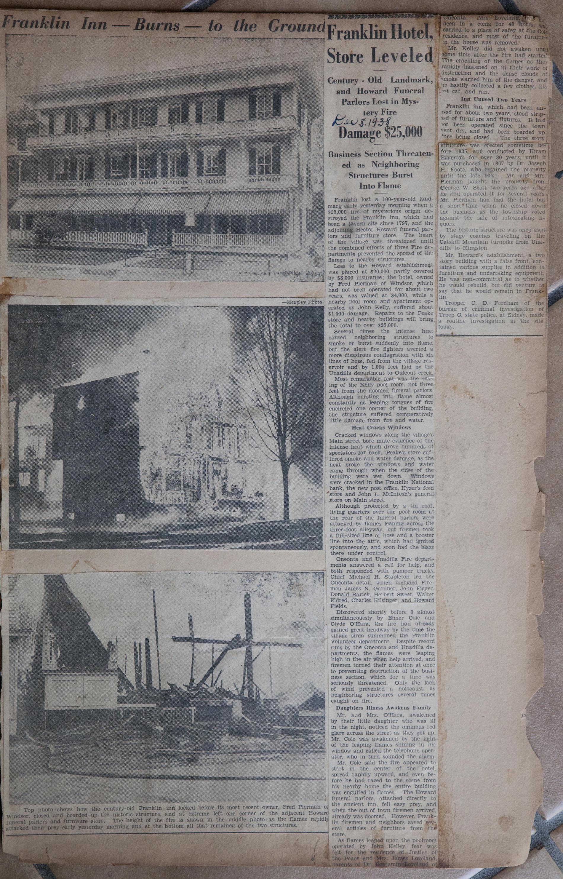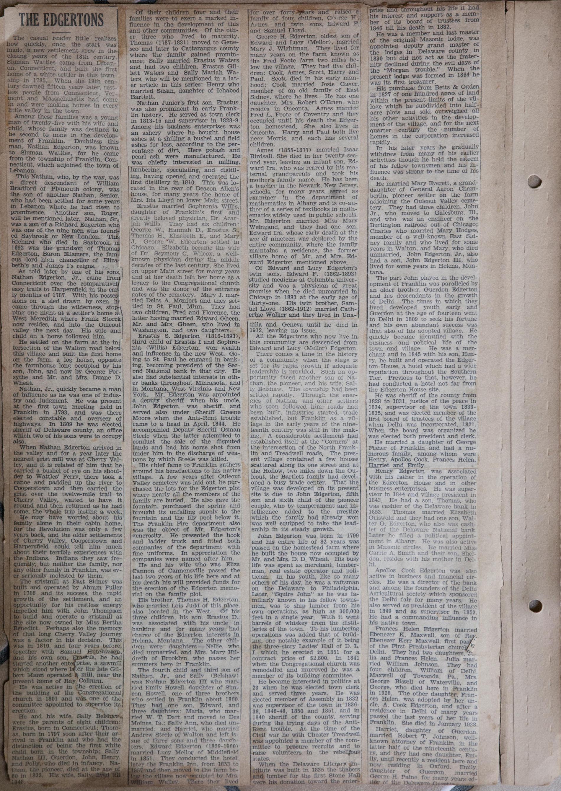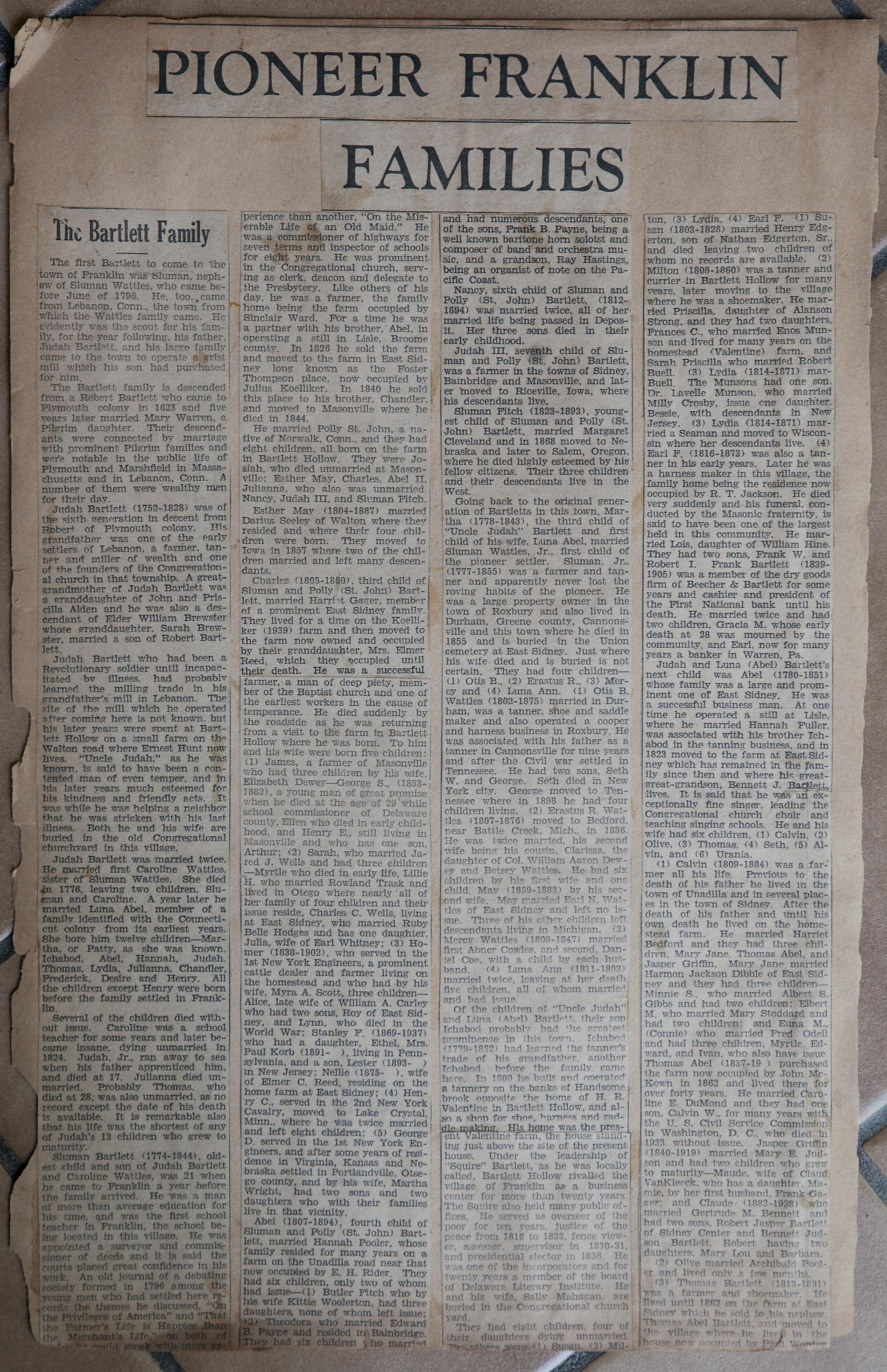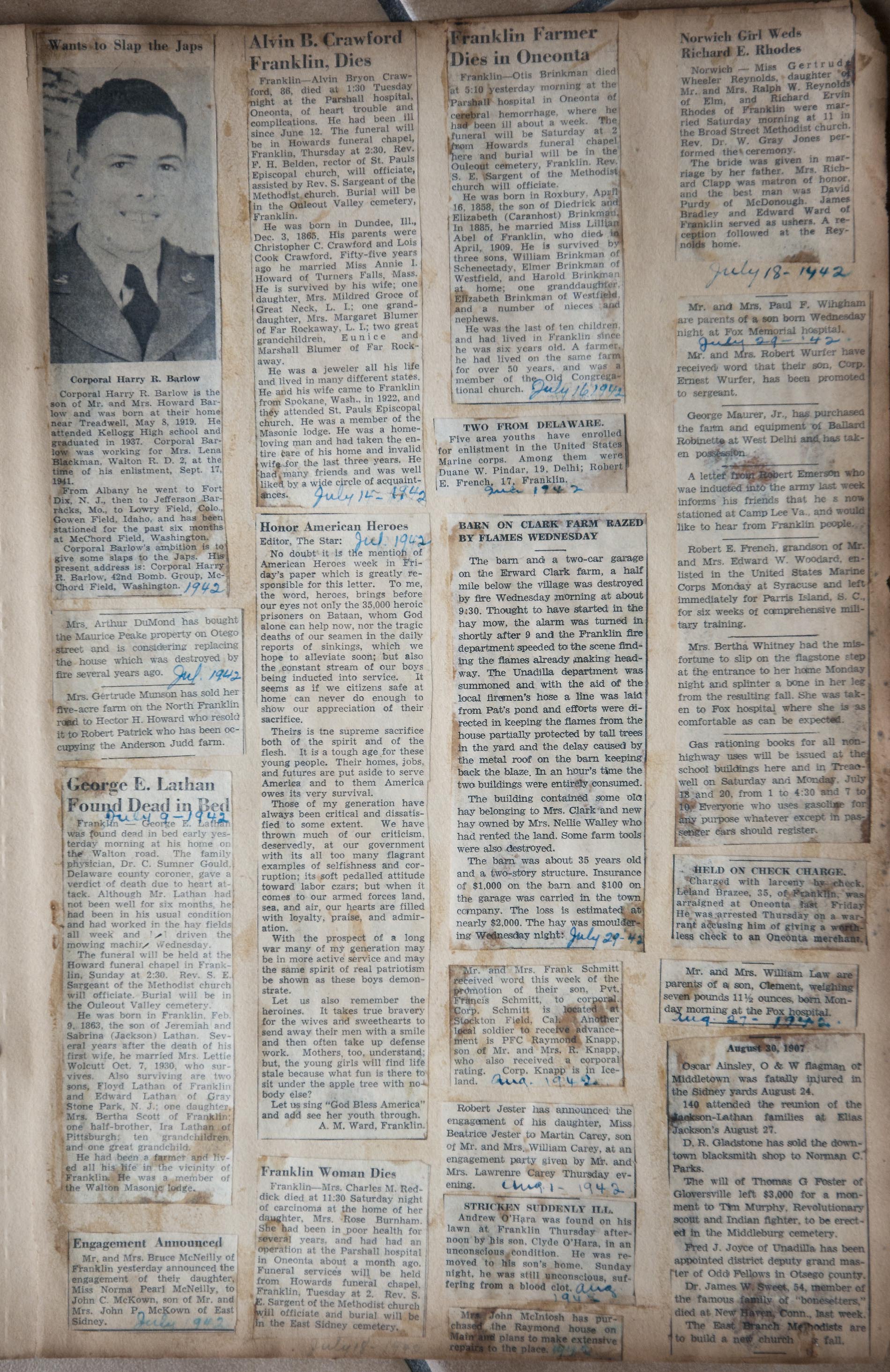 My name is Chuck Braden and I live in Ohio. I was in an antique mall today and came across a scrapbook full of clippings of Franklin, NY from 1938-1942. There are obituaries, marriages, articles about people from the area, and so much more. There has to be at least 50 pages of solid clippings. I am into genealogy and truly feel this could be very beneficial to families from your area. --Chuck Braden, July 22, 2017