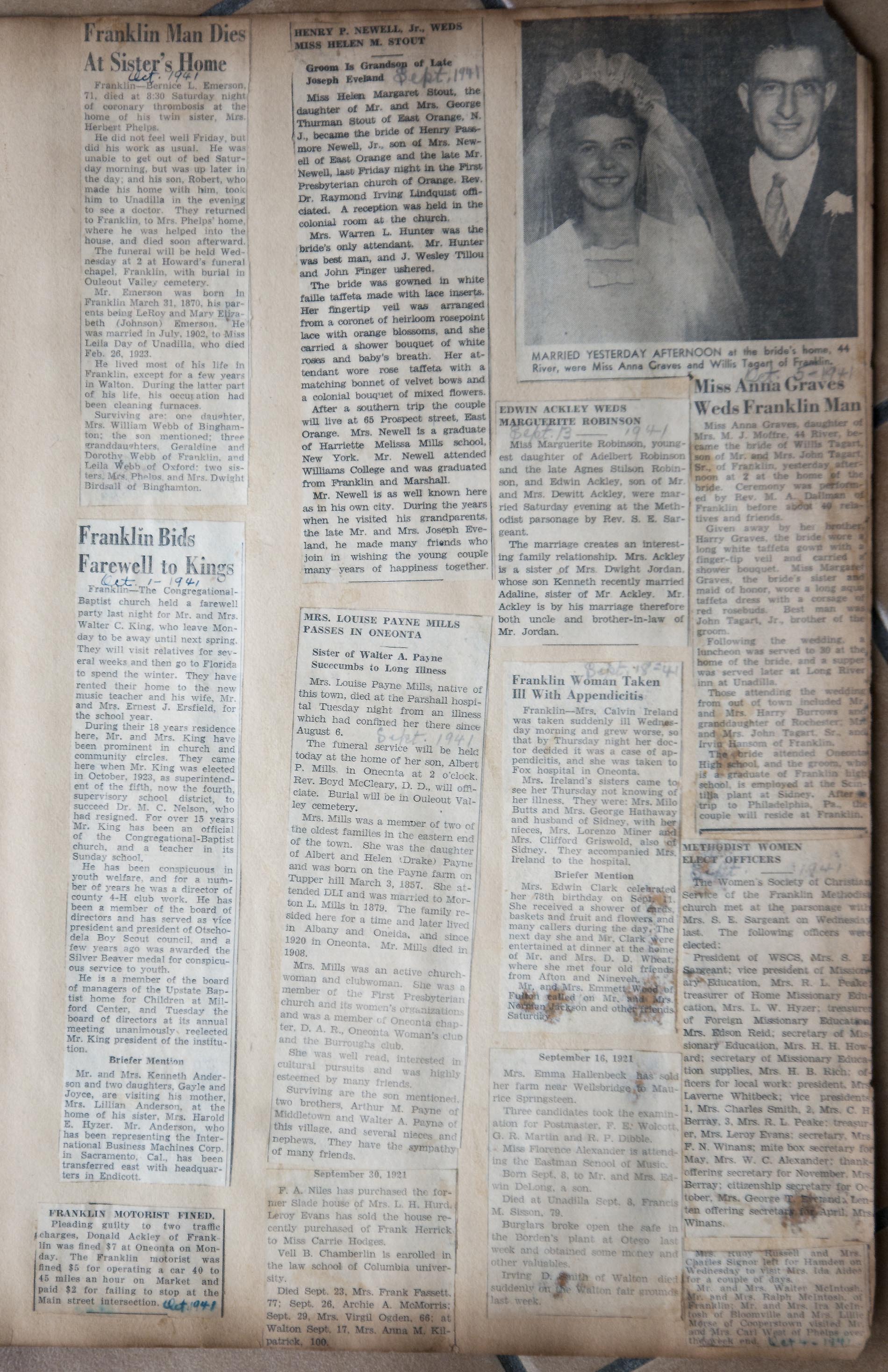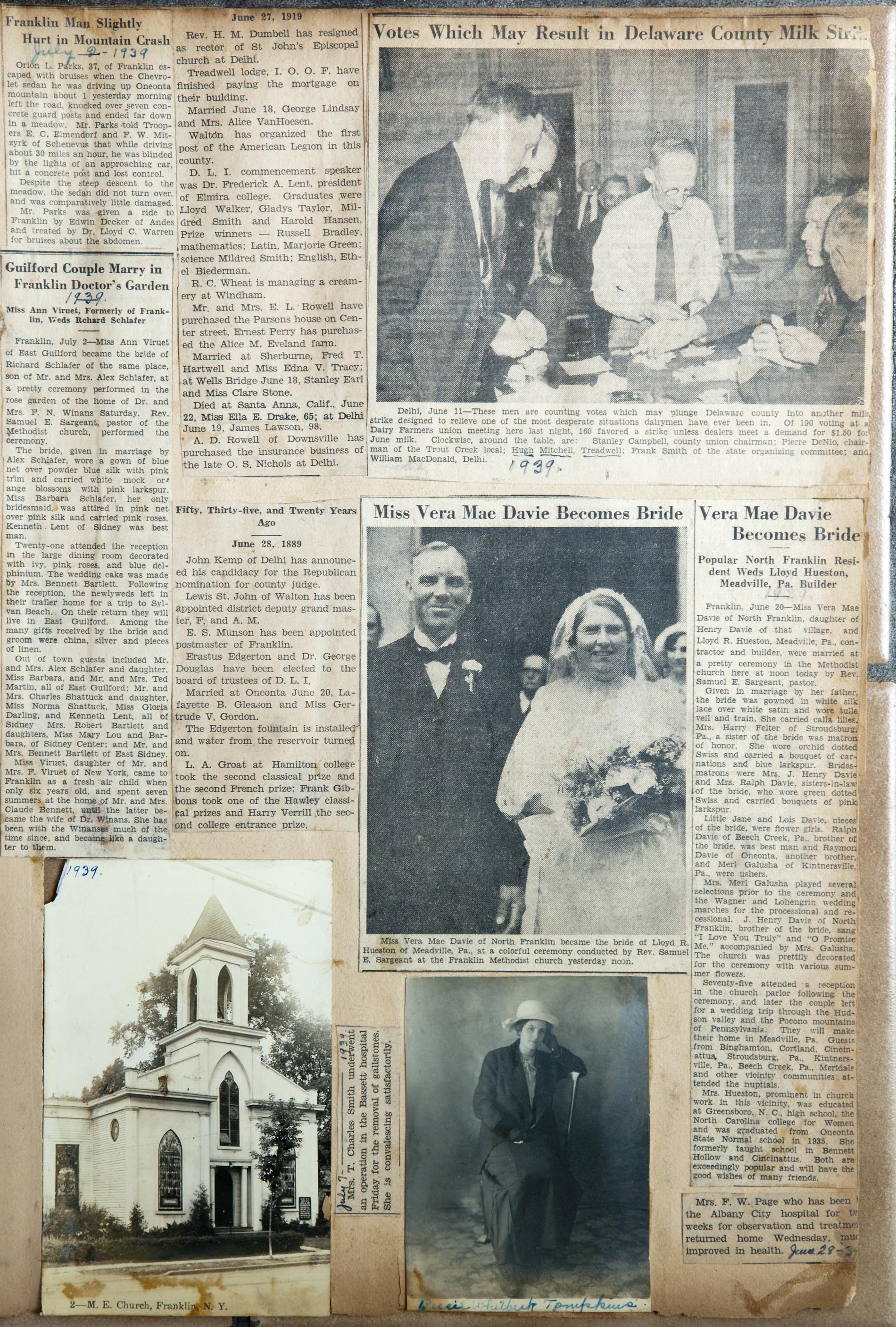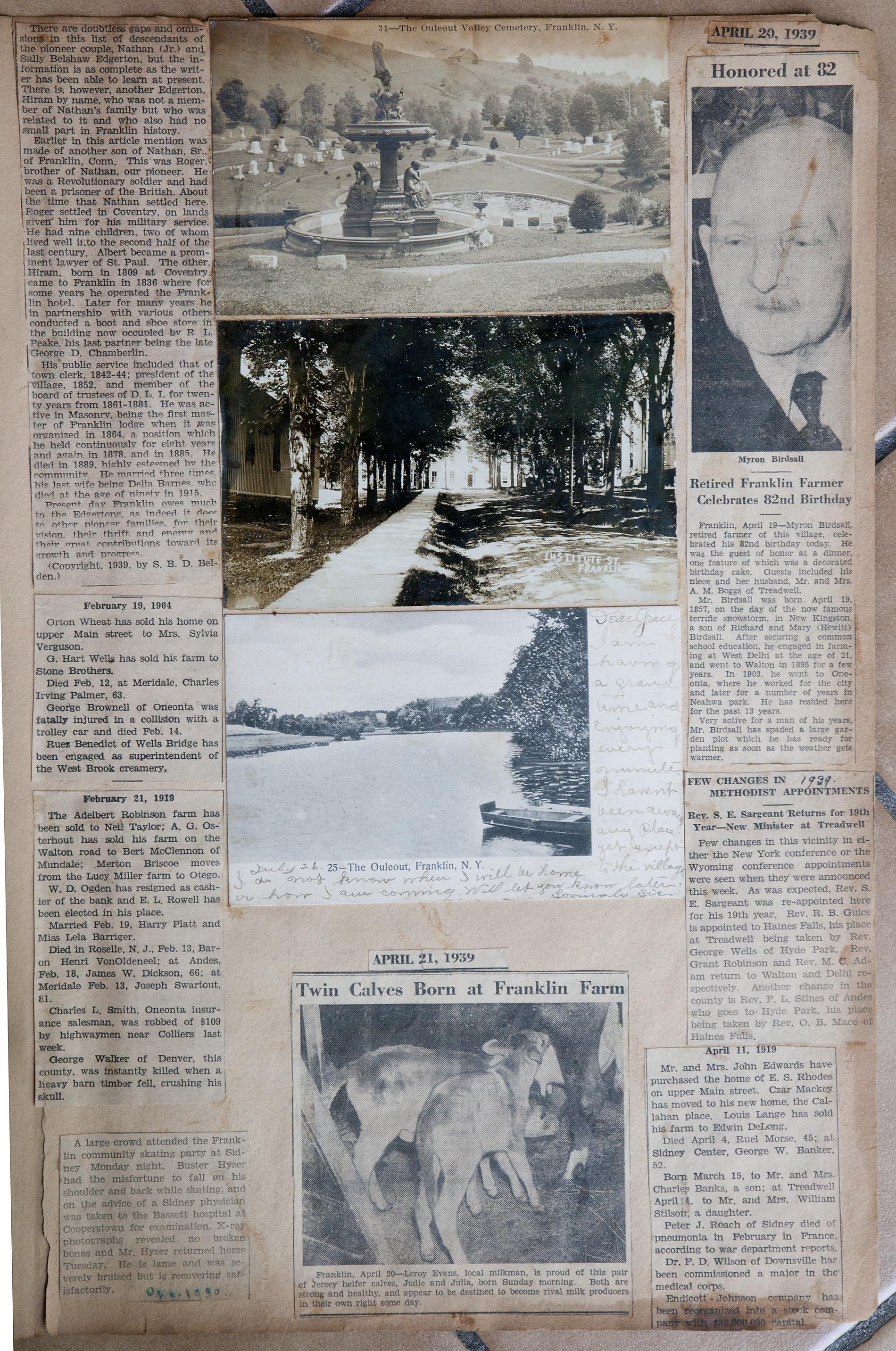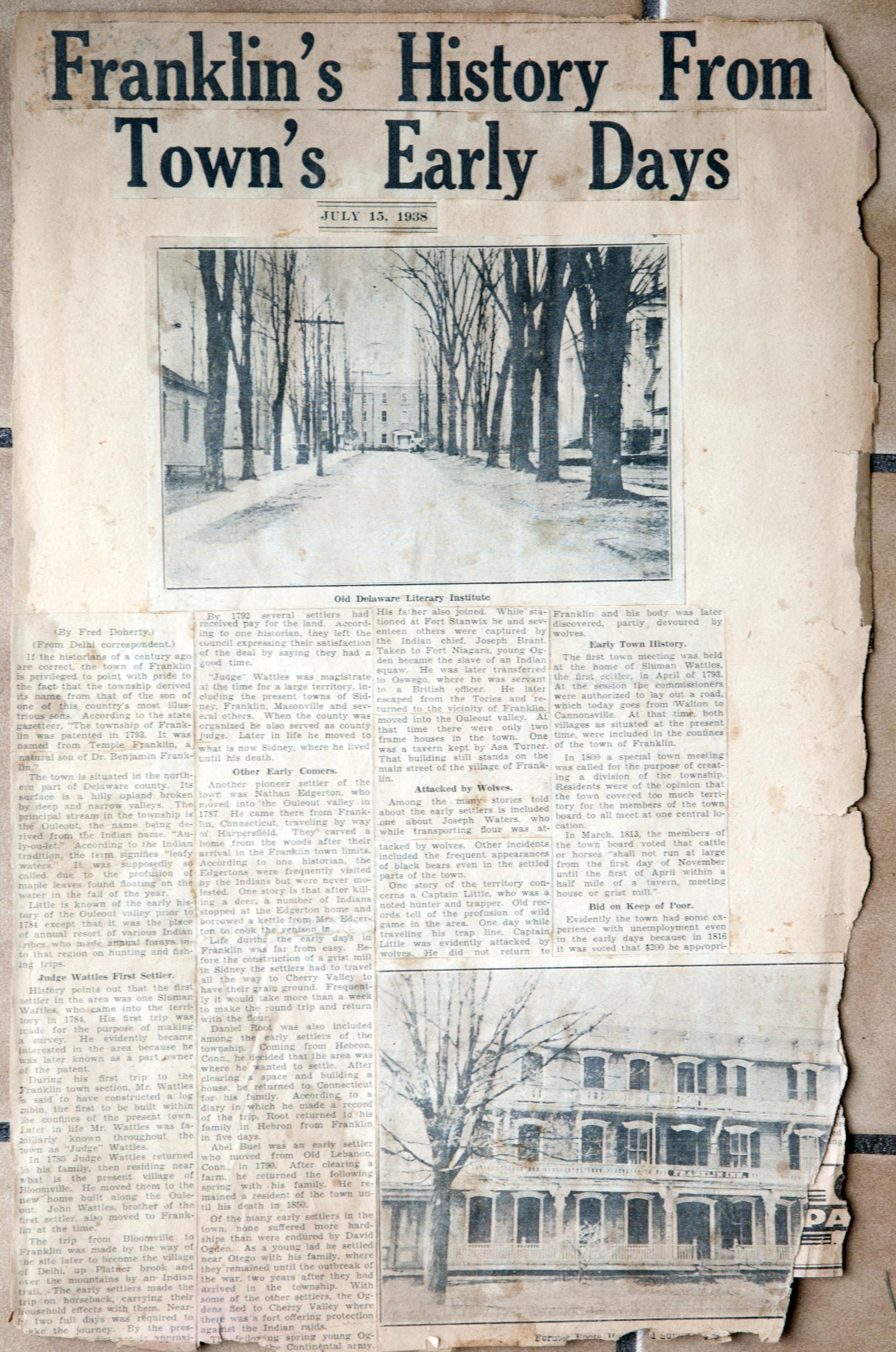 My name is Chuck Braden and I live in Ohio. I was in an antique mall today and came across a scrapbook full of clippings of Franklin, NY from 1938-1942. There are obituaries, marriages, articles about people from the area, and so much more. There has to be at least 50 pages of solid clippings. I am into genealogy and truly feel this could be very beneficial to families from your area. --Chuck Braden, July 22, 2017