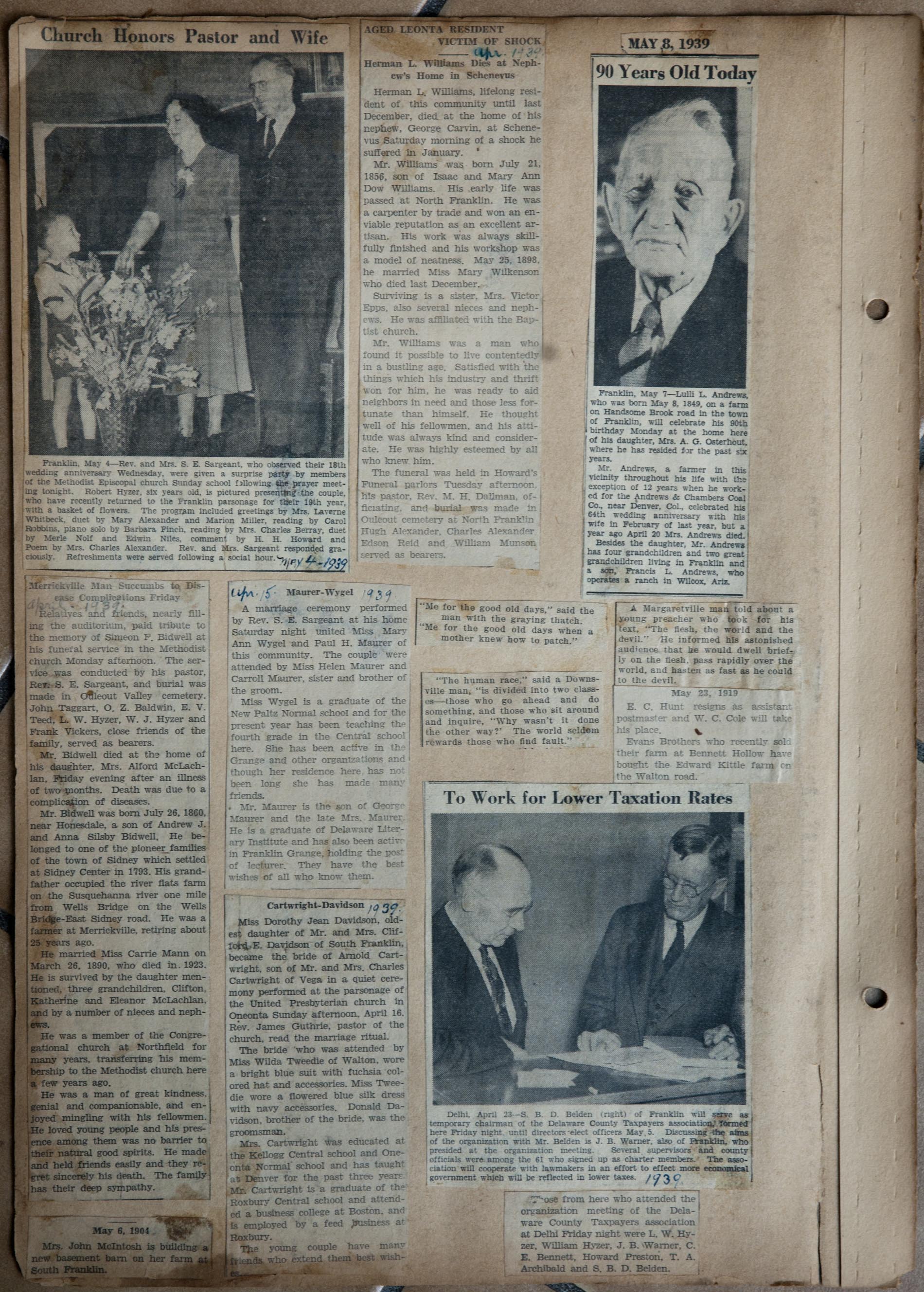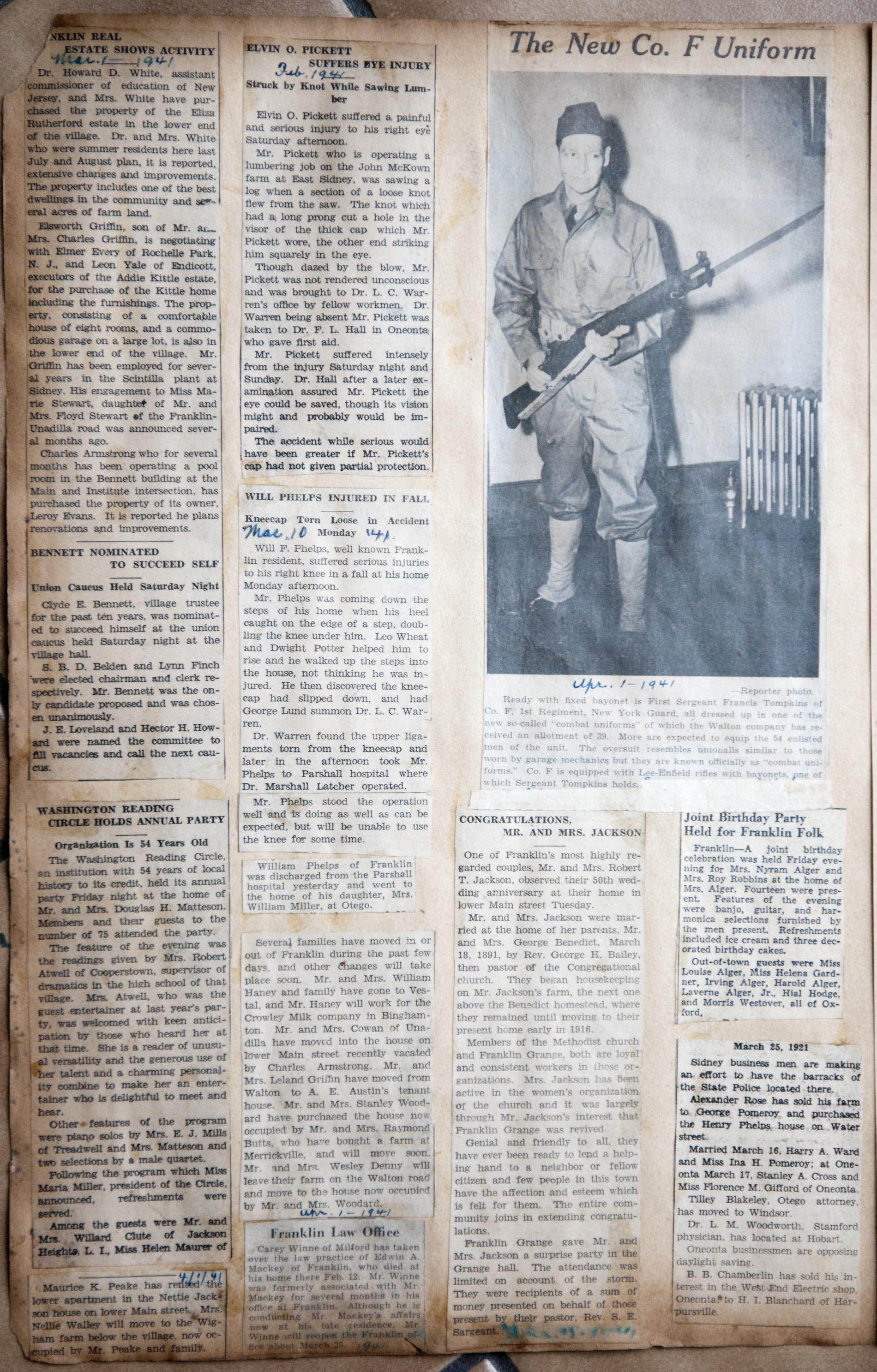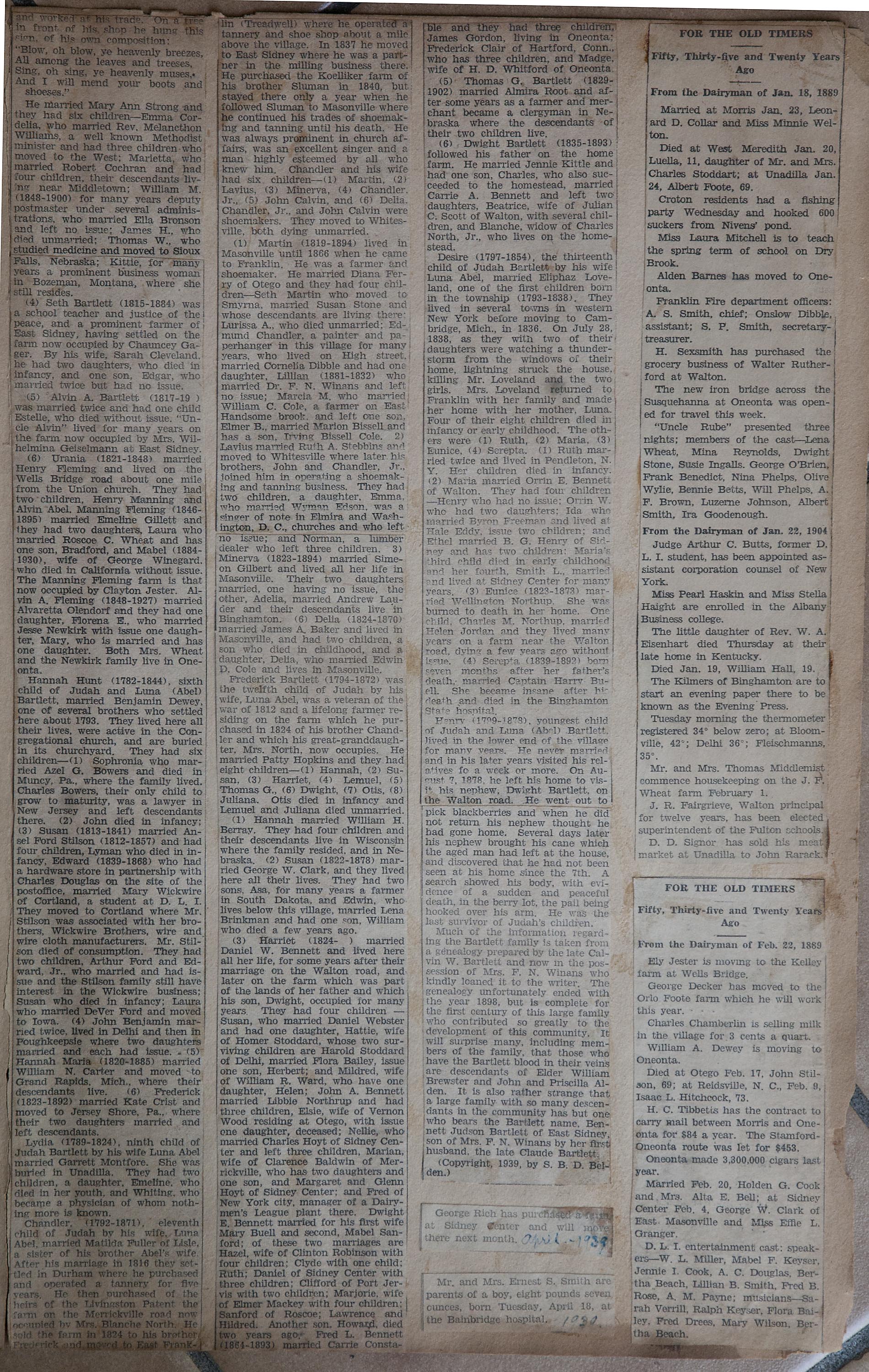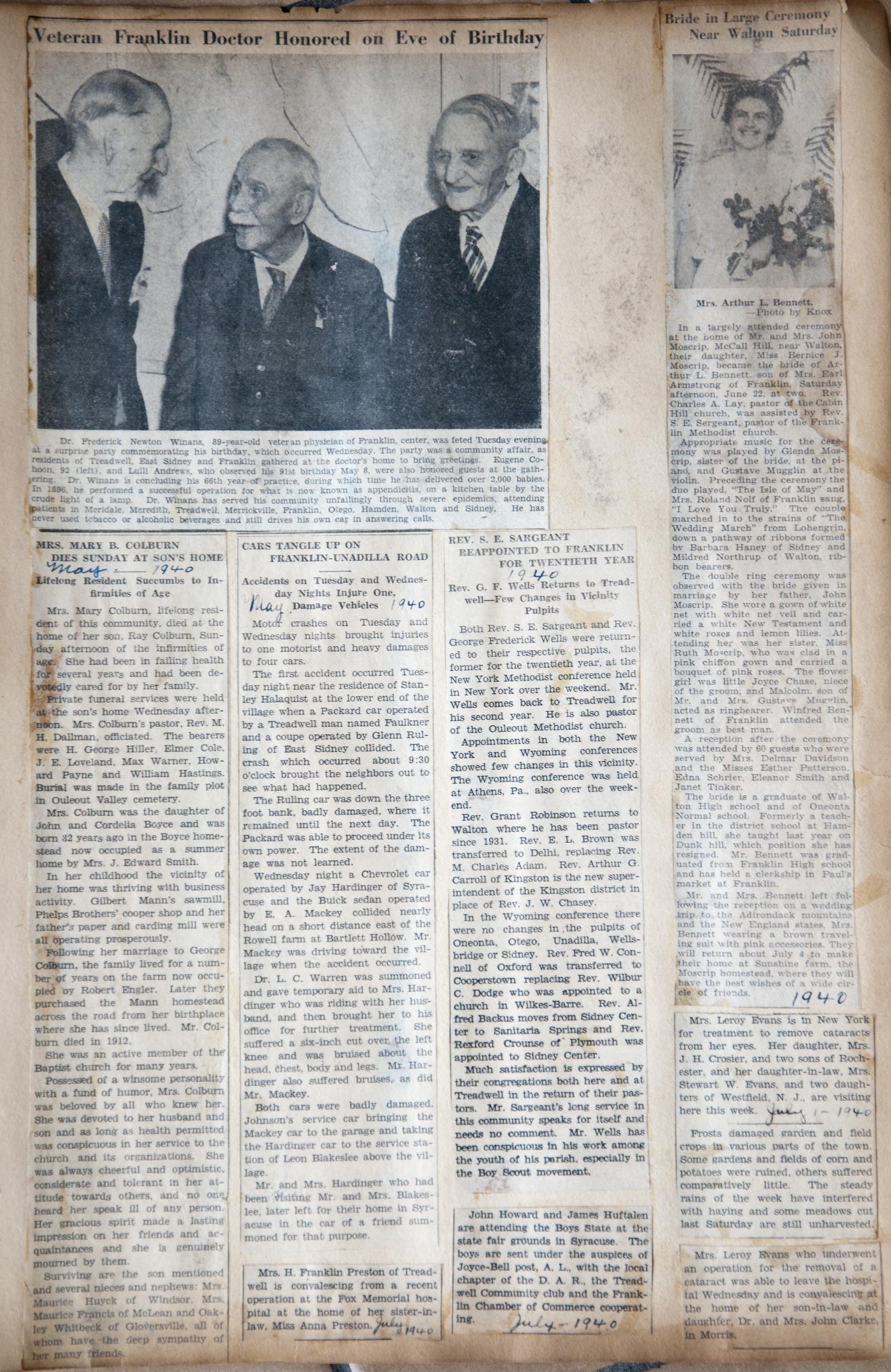 My name is Chuck Braden and I live in Ohio. I was in an antique mall today and came across a scrapbook full of clippings of Franklin, NY from 1938-1942. There are obituaries, marriages, articles about people from the area, and so much more. There has to be at least 50 pages of solid clippings. I am into genealogy and truly feel this could be very beneficial to families from your area. --Chuck Braden, July 22, 2017