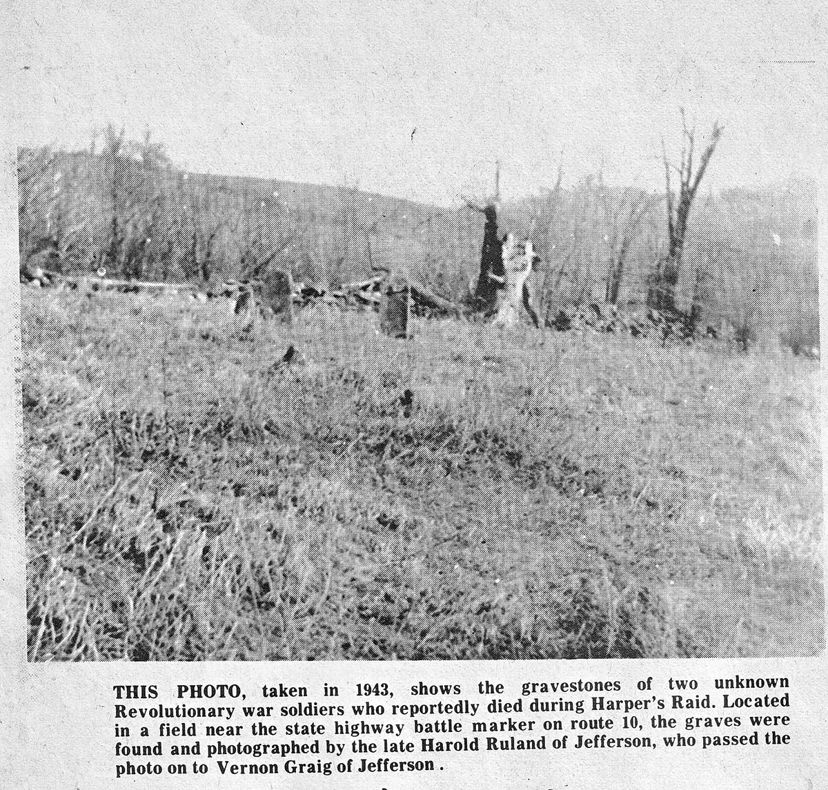 Photo at left taken in 1943 of two unknown Revolutionary War soldiers (no other burials nearby), appeared in the Mirror Recorder on October 13, 1976. This was a special edition in recognition of America's Bicentennial. I have been trying to find out if these markers are still in existence and if anyone has updated photos and any other information. The property that the stones may be on was owned by the Haines family . The last of the Haines were Fred and his sister Nellie and they had farmed it there for many years.. It had been in their family since the early 1830's The sign is located at a small pull off spot just pass what use to be Scotch Valley (Deer Run ski resort) on State Rt. 10 heading towards Jefferson on the right side of the road.