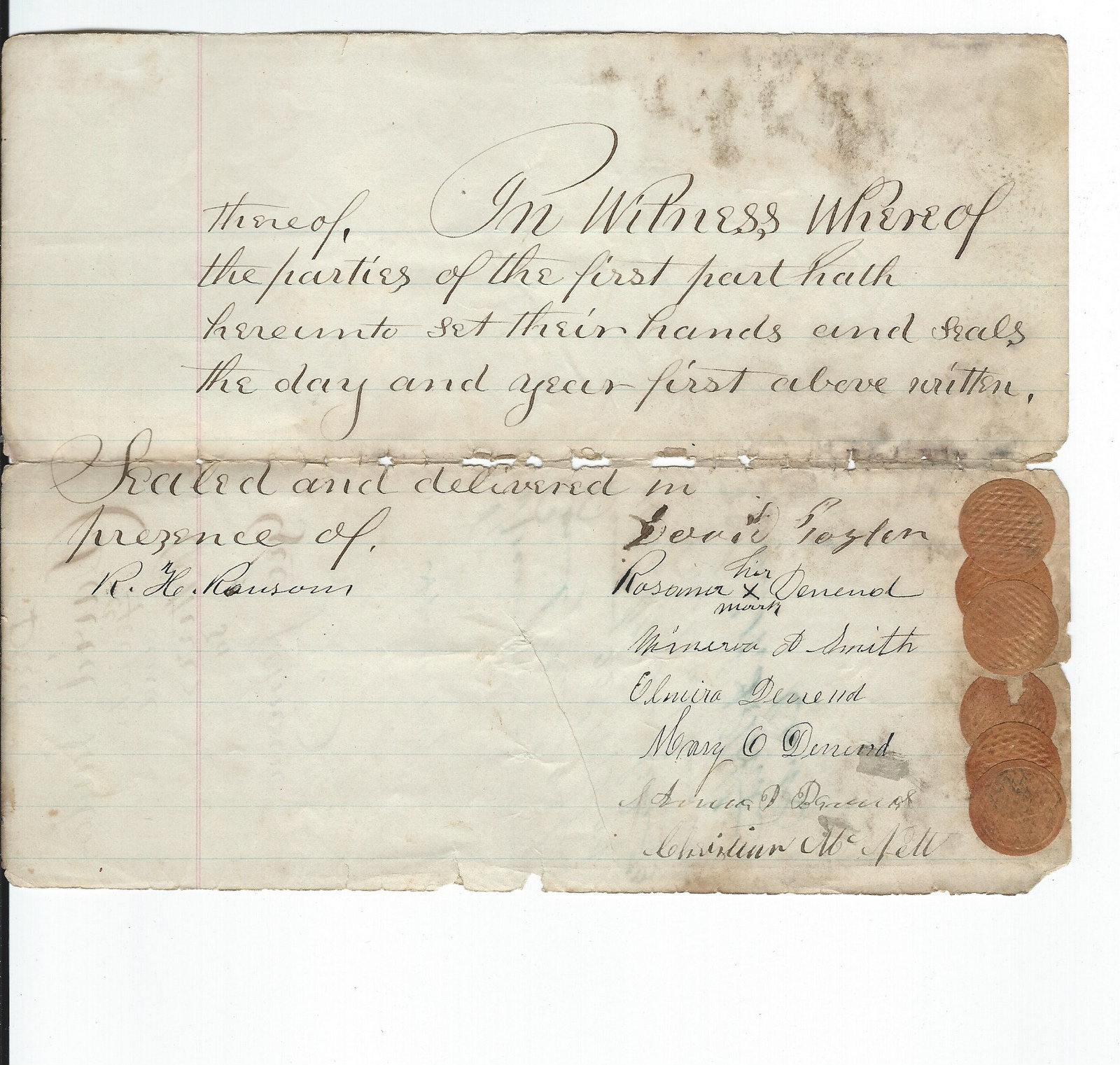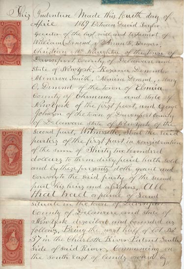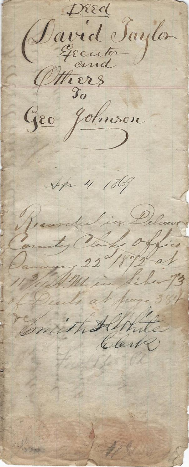This is a land sale document in Davenport. Denend, Taylor, Johnson families might find it interesting. I have no idea why my grandmother had it except perhaps it was land that her father, Tunis Cooper Judd bought well after the 1869 date. I believe that was in Davenport Center and this document may be that land. It wasn’t recorded until 1872. --Paula Hughson