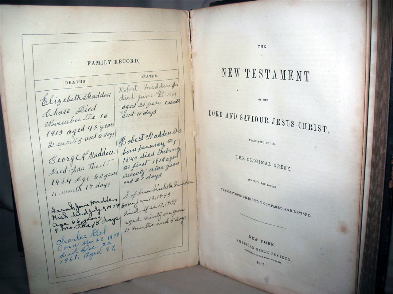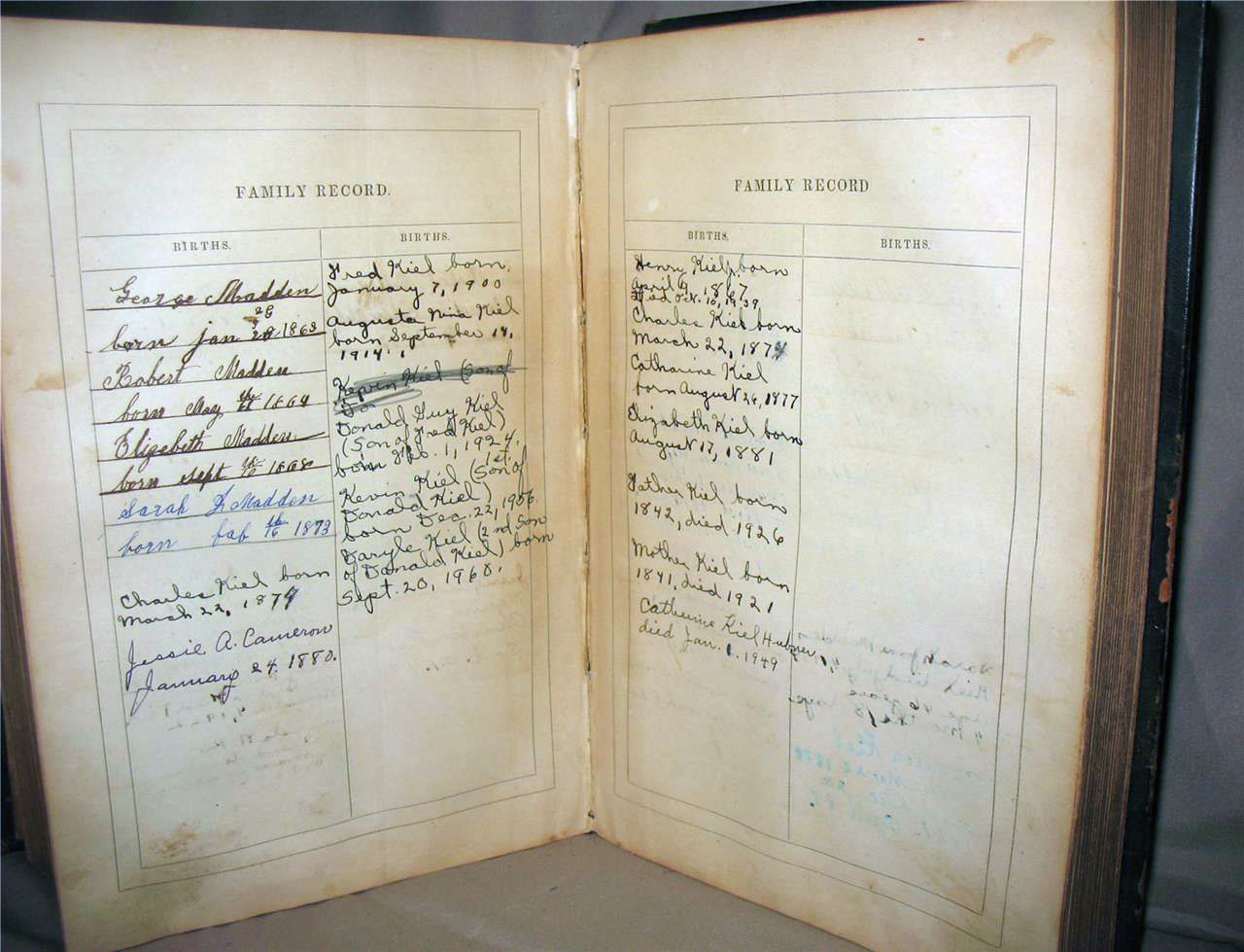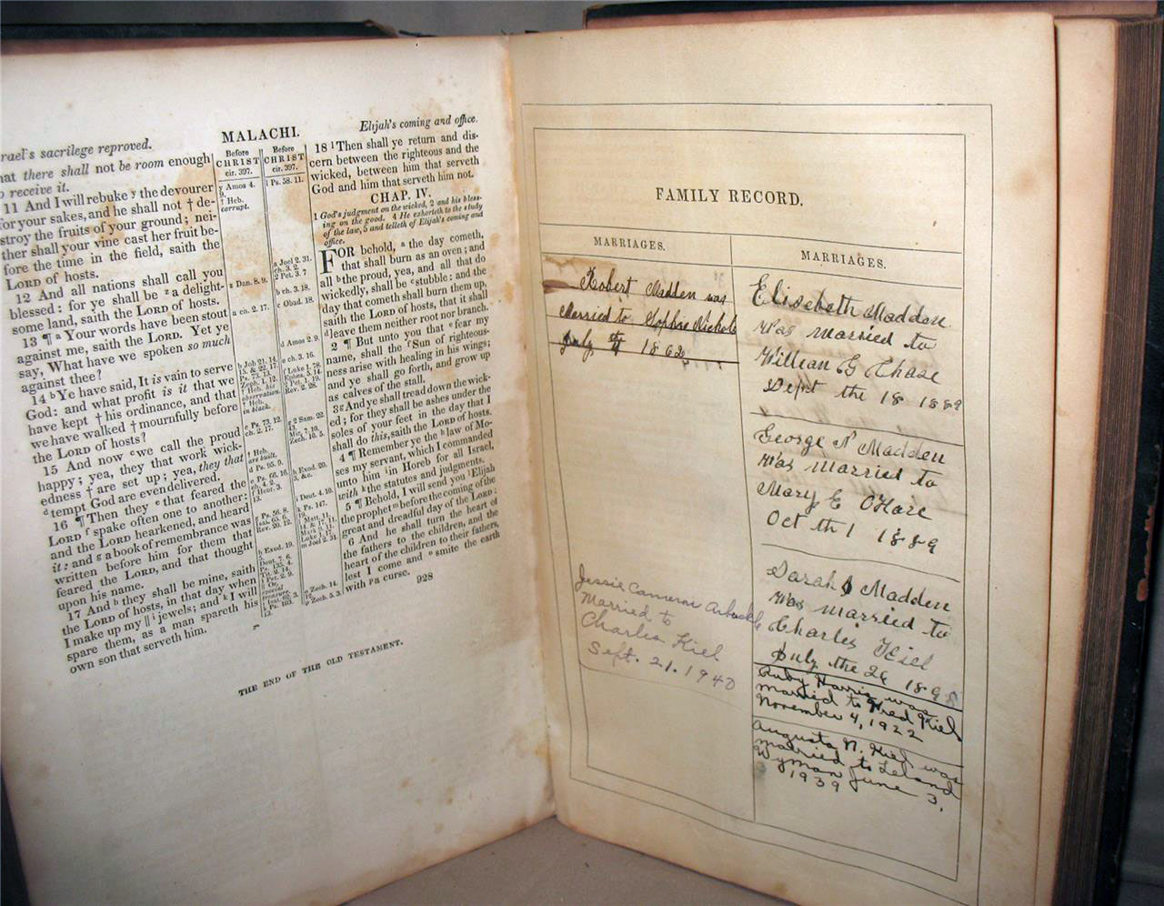 I had an extraordinary find recently, thanks to another genealogist, Pam Beveridge, a resident of Maine and blogger of Heirlooms Reunited. Pam alerted me to a Bible for sale on eBay, I made an offer, and gave it to my husband as an early Father's Day gift. It's a Madden/Nichols/Kiel Bible with my husband’s paternal grandmother’s parents George N. Madden and Mary Elizabeth O’Hare and gggrandparents Robert Madden and Sophia Nichols and many Kiels. I suspect that it belonged to Sarah Kiel. --Lesley K. Cafarelli, May 24, 2016