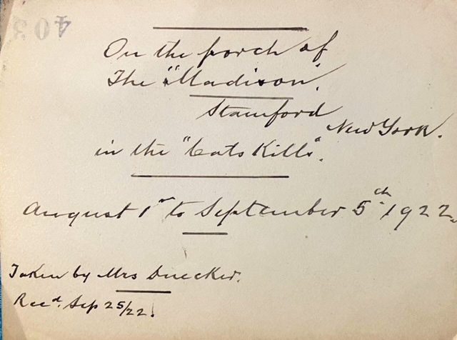 I just wanted to pass on this photo of life on the porch at The Madison, from 1922. I was partially intrigued by the details of the inscription on the back, which made it easy to research. Unfortunately no names of the subjects but the photographer is named. --Jamie Pennington, 29 May 2021