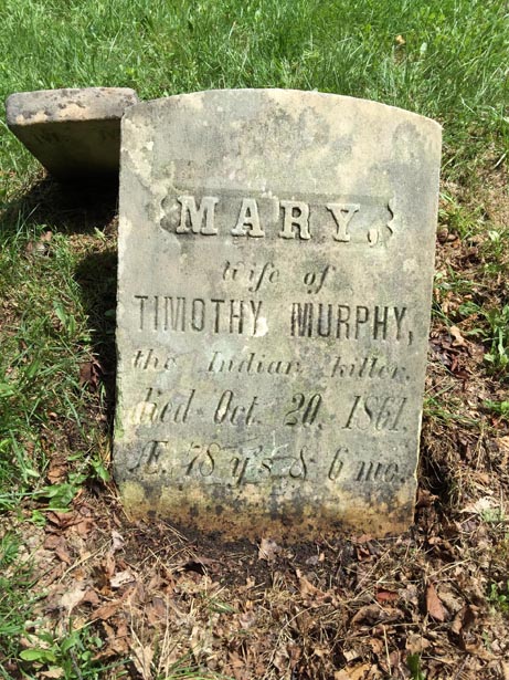 On her gravestone are the words "Mary Murphy, wife of Timothy Murphy, the Indian Killer". It's the same Timothy Murphy who shot the British General at the Battle of Saratoga which enabled the Patriots to win the battle and France to enter the war on the side of the Americans. Timothy and his first wife, Margaret Murphy, are buried in Middleburgh and there's a statue of him in Schoharie. He and Margaret had 5 sons and 4 daughters. After she died, he married Mary and they had 4 sons. Timothy and Mary lived at the farm in Charlottesville. Margaret was his consort (she died first) and Mary his relict (she was living when he died)