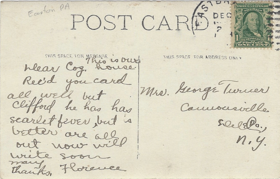 A bit of research (by others) suggests that this postcard (c. 1908) was sent by Florence Smith (married to Melvin Smith) of East Branch, who had a son Clifford (b. 1903). I wonder if this home is familiar to anybody? Not Easton PA-- Scott G.