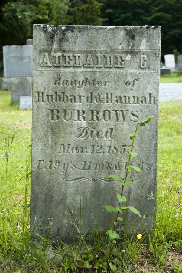 Burrows, Adelaide C. Mar. 12, 1853 Aged 19y 11m 18d. Dau of Hubbard and Hannah Burrows
