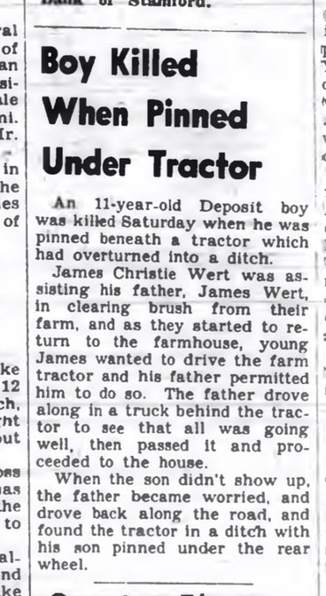 My uncle’s name was James V. Wert. He bought land in the Sanford/Deposit area from an A. Cutting in approximately 1955. On March 16, 1957, his 11 year old son, James A. Wert, was killed on this farm in a tragic tractor accident (see clipping). Some of the papers say the accident was in Deposit, NY...other clippings say Sanford.