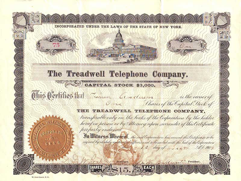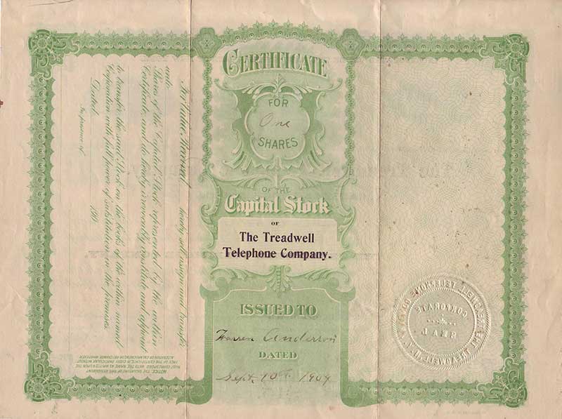 For the Treadwell Telephone Co. - (click here for the front) and (click here for the back of the certificate). Just thought these might be of interest to a few folks in Franklin. Also thought I should add my family to the members of the community since they have been there for about 151 years. We do still have members of our family living there. A lot of them still live very close to the original homestead.