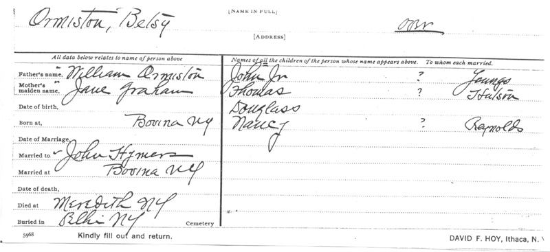 INTRODUCTION - read about this project Early in the 20th Century, starting around 1914, David Fletcher Hoy (1863-1930) created a very large card file to document all Bovina families. The cards included names, birth, marriage and death information. The card file eventually went to his niece Vera Davidson Storie (1891-1967), then to her daughter, Rae Storie Vandenbord. Vera's brother, Fletcher Davidson (1895-1987), took the files and created a large set of notebooks transcribing the information from the cards. This was a herculean task -- all the more so because it was all done by hand. It was 1600 handwritten pages when completed. Starting in September 2001, I took on the task of transcribing Fletcher's Davidson transcription, completing the project in February of 2003. I estimated that there were about 12,000 entries when the project was done. How this Information is Organized The format is fairly simple. Names are in alphabetical order by last name. Each name has an entry. A full record will include name of parents, date of birth (Born), marriage date and to whom married (Married), date of death (Died), where buried (Buried) and children (Children). For each child's name, researchers should look to see if there is a separate entry for that child. In some cases, there is no further information than the child's name. In those instances, no further entries were made, but if there was information about birth, marriage or death, then there will be a separate entry. During the course of updating this information (more about this below), I added in parentheses right after the name the addresses that David Hoy noted on the card. This indicates the address of the person around the time the information was collected. Women are listed. If they married and had children, researchers will want to go to the section of the list for the woman's married name to find any information that might exist on her children. If a researcher notes that an entry does not have all this information, that reflects the information in the card files. Nothing was left out unless it was illegible. Corrections/Update Because these names came from a transcription of a transcription, mistakes crept in (sometimes at a gallop!). Handwriting was hard to read and typos were easy to make. Since the project's completion, a number of people have contacted me with corrections. Often, the error was mine, but I also discovered some of the errors were Mr. Davidson's. I want to thank everyone who submitted corrections. A particular thank you to Fletcher's son, Eddie, who has caught numerous typos I made. In the Spring of 2004, I gained access to David Fletcher Hoy's original card file, so I decided that I should compare my transcription to the original Hoy files. This would allow me to catch my errors and any Fletcher may have made. I've also found some errors in the Hoy files, possibly a case of simply inverting digits. I've also noticed updates made to the cards by others, mostly likely by Fletcher. I've updated and corrected what I submitted and have included corrections others have submitted. On occasion, I'll find an error in the cards. In one instance, I found someone who was born 7 years after they came to Bovina! When I can't correct such errors, I've left the information out. The first set of corrections was submitted in March of 2005. This will probably take over a year to complete. A plea from the late Alan Davidson concerning the original card files: "Through the years the files have been decimated somewhat. Many genealogists borrowed portions of the files from time to time and some "forgot " to return them. I have been advised that when my father set out to transcribe the entire file, all the "Coulters" were missing. (This was before his death fourteen years ago.) And just last summer it came to light that all the "Burns cards" are also missing. Now, between the Coulters and the Burns, that is a goodly chunk of the Bovina people! It makes you wonder, who else is missing? " The original file was composed of "cards" (actually slips of paper) 4"x 8 1/2" , like the sample shown below. I would like all you genealogists out there to search your written records to see if you have any like them--particularly the originals. The one(s) shown are in David Hoy's handwriting." If you find any, (originals or copies) please make copies for yourselves to keep and return to my address: Ray LaFever, 2319 County Highway 6, Bovina Center, NY 13740. We will see that they are returned to their proper home and we thank you for your cooperation. Final Advisory Please keep in mind that the David Hoy card files contained no information as to the source of the information. His source usually was a family member and in the vast majority of instances, it is no longer possible to determine who his source was. I strongly encourage researchers to verify the information in this transcription with primary sources. Mr. Hoy's work overall has stood the test of time, but sometimes his information was only as good as that of his source. Errors do happen. And the families here are not limited to just Bovina. Delaware County is well represented here. Good luck and happy hunting. Ray LaFever, March 5, 2005