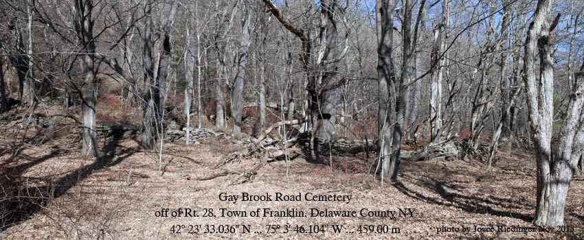 I would like to add some information to the recording of the Gay Brook Road Cemetery entered by Mr. and Mrs. Taylor June 13, 1998. I copied this cemetery in 1965 when it was on property owned by my Father-in-law and was in a better condition than today, although it was in poor condition even then. DGP262@aol.com