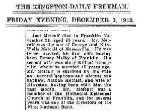 submitted by Cheryl Harding; posted to this website October 19, 2017 Joel Metcalf died in Franklin, November 28, aged 85 years. Mr. Metcalf was the son of George and Eliza Wells Metcalf of Masonville. He was twice married, his first wife having been Betsey Malby of Franklin. His second wife was Mary Kiff of Bloomville, whom he married 45 years ago. Mr. Megcalf is survived by his wife and several nephews and nieces; one nephew, Nathan Metcalf, and wife of Kingston, having been with him the past month. Mr. Metcalf was a member of the Methodist Episcopal Church of Franklin, and for several years was one of the directors of the First National Bank. (see obit clip)