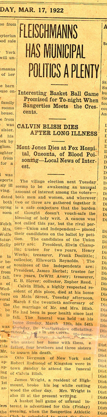From Harpersfield Cor. Mr. Henderson, who was thrown several feet into the Wickham yard, was carried into the house while Jay Wickham took his car and hastened to Stamford for a physician. Dr. Kogan was summoned who found that Mr. Henderson had sustained a badly fractured leg, a broken wrist, broken nose and jaw bone, also a fractured skull and a long gash over one eye. After making the patient as comfortable as possible, he was taken in Hall's ambulance to the Bathgate Hospital in Stamford where he passed away on Friday morning, March 19, without ever regaining consciousness. James Henderson was born in Harpersfield, December 1, 1879, the youngest child of William and Sarah (Tate) Henderson, and with the exception of a few years spent in White Lake, South Dakota, his entire life had been spent in Harpersfield and vicinity. On June 27, 1899, he was united in marriage with Miss Lizzie Mae Grinnell, also of Harpersfield. For many years he engaged in farming and at one time held the office of superintendent of highways of the town of Harpersfield. At the time of his death he was a valued salesman for the Franklin Motor Sales Company of Oneonta. He is survived by the widow; four daughters, Mrs. Albert Sherman of Stamford, Mrs. Gordon Wilson of Delhi, Mrs. Jay Vroman of Hobart, Mrs. Renford Grow of Grand Gorge; one son, Alton of Harpersfield; one sister, Mrs. Frances Van Dusen of North Kortright, and one brother, Joseph R Henderson of West Harpersfield: besides several grandchildren. Deceased was a member of the Harpersfield M. E. Church, the Men's Club and Col. Harper Grange. He was also a member of the dart ball league and took a keen interest in the affairs of the church and community. In politics he was a staunch Democrat, and had served as county committeeman for the past several years. "Jim" Henderson will be greatly missed by a host of friends. His kindly, congenial nature won him the esteem of friends from every walk in life and his untimely death has cast a gloom over the whole community. He was a devoted husband and father and his family will have the sympathy of all in their sad bereavement. Funeral services were held from the the Harpersfield Church on Monday afternoon, March 22. Rev. S. S. Robbins, his pastor, and Rev. H. A. Armitage of North Kortright officiated. A duet "Some Time We'll Understand," was sung by Mrs. O. S. Peters and Mrs. Theresa Gaylord. There was a large concourse of sorrowing relatives and friends to pay tribute and the beautiful flowers attested to the esteem in which the deceased was held. Among them were pieces from The Franklin Motor Sales Company, Col Harper Grange, Ladies' Aid of the Harpersfield Church, Men's Club of Harpersfield-North Kortright churches, Mt Jefferson Club, employees of Taylor farm, Harpersfield Dart Ball Club and the Delaware Dart Ball League, besides several