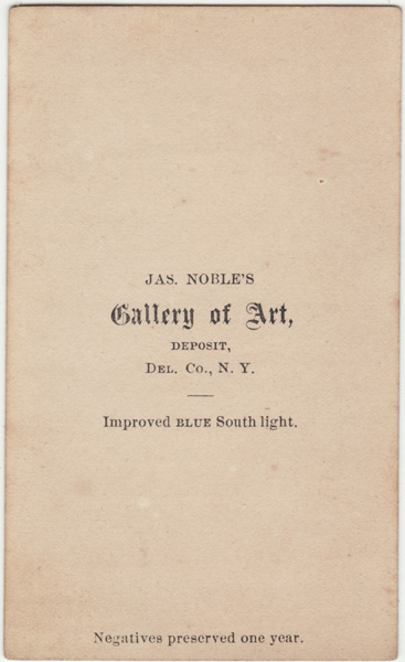Below is a list of Walton photographers that I compiled for my own reference when dating family photographs. The dates and notes below were compiled from dated photographs, local histories, newspaper accounts, census records, and advertisements for the photographers' work. Some photographers worked in other Delaware County towns; this list only pertains to their time in Walton. This list is not complete and should only be used as a general guideline when dating a photograph. -- Carolee Inskeep