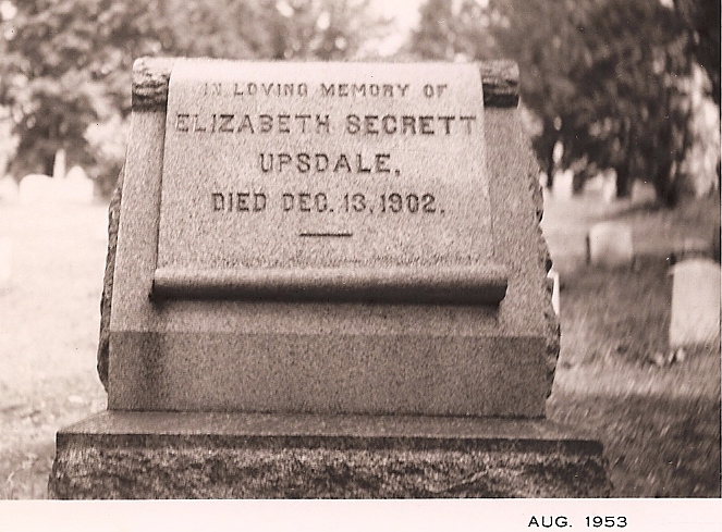 UPSDALE - I am trying to find an obituary for my great-great grandmother, Elizabeth Secrett Upsdale. To the best of my knowledge, she died in Sidney, December 13, 1902. The 1900 Census shows her living with her three daughters and one son-in-law (Thomas Palmer). SEE PHOTO of her gravestone dated 1953 which I believe is in Sidney but I am unsure of the cemetery.