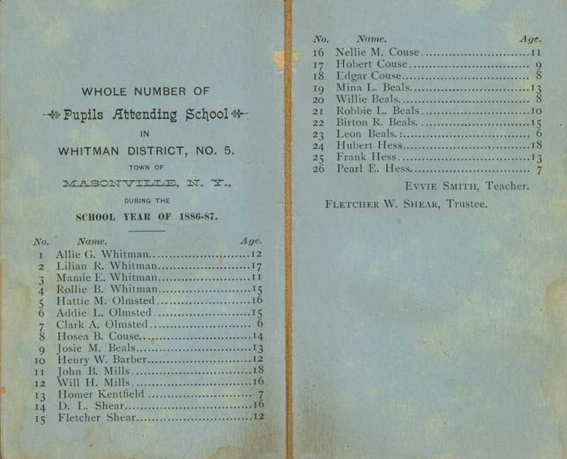 This is the inside and outside of a school booklet for the Masonville – Whitman District No 5 school for the school year 1886 - 1887. The original is owned by Graydon Stoddard of Melborne - Pearl Hess and Hobert Couse that are listed on the school list are his maternal grandparents. Graydon is my second cousin once removed and was gracious to allow me to scan in some of his family collection. Many of the students attending this school are first, second and etc. cousins. Pearl Hess and Hobert Couse are second cousins by way of their Whitman Great Grandparents. Nellie Couse was my great grandmother and her children attended this school also. --Courtesy of Louise Chen, June 24, 2008 ![]() Welcome Page of the Delaware County NY Genealogy and History Site . . . | . . . Table of Contents Page . . . | . . . Contact Site Manager
